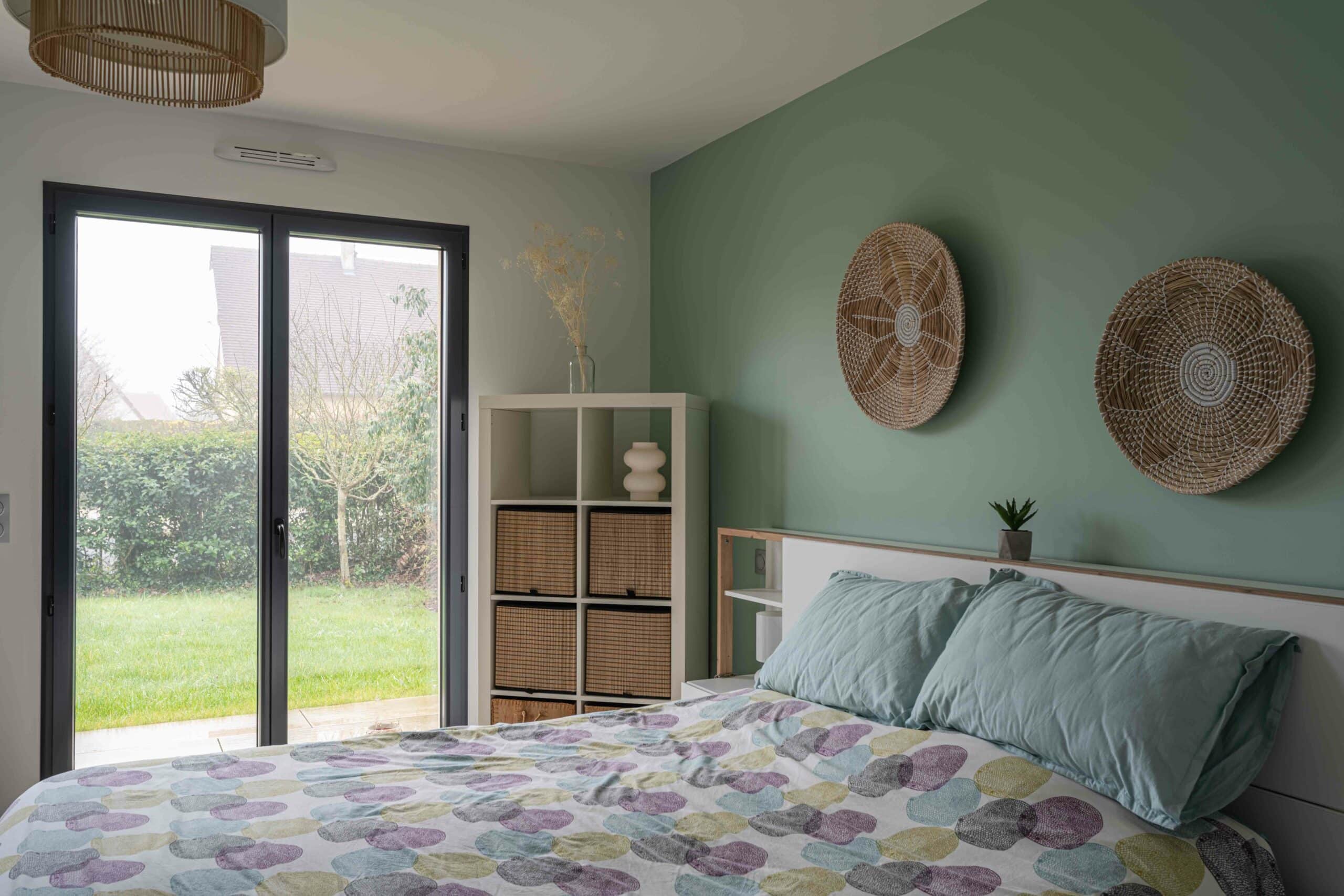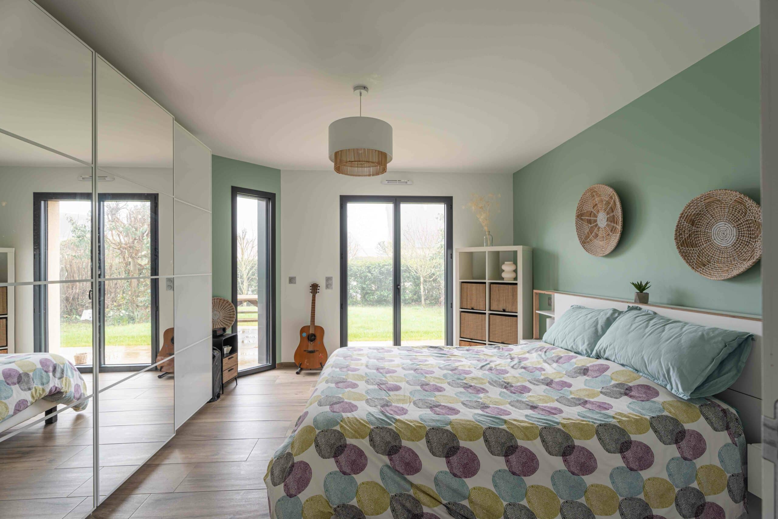 • Une chambre spacieuse, baignée de lumière naturelle et ouverte directement sur l’extérieur grâce à une large baie vitrée.