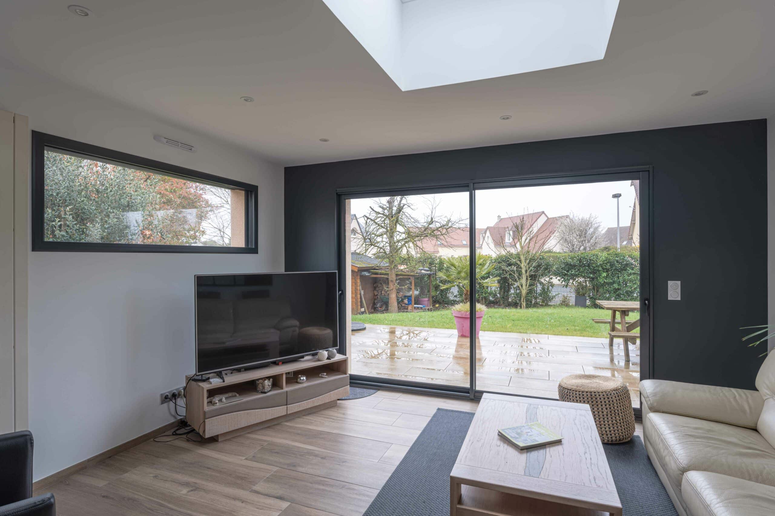 Associé aux grandes baies vitrées, ce puits de lumière transforme le salon en un espace clair, ouvert et agréable à vivre en toute saison.