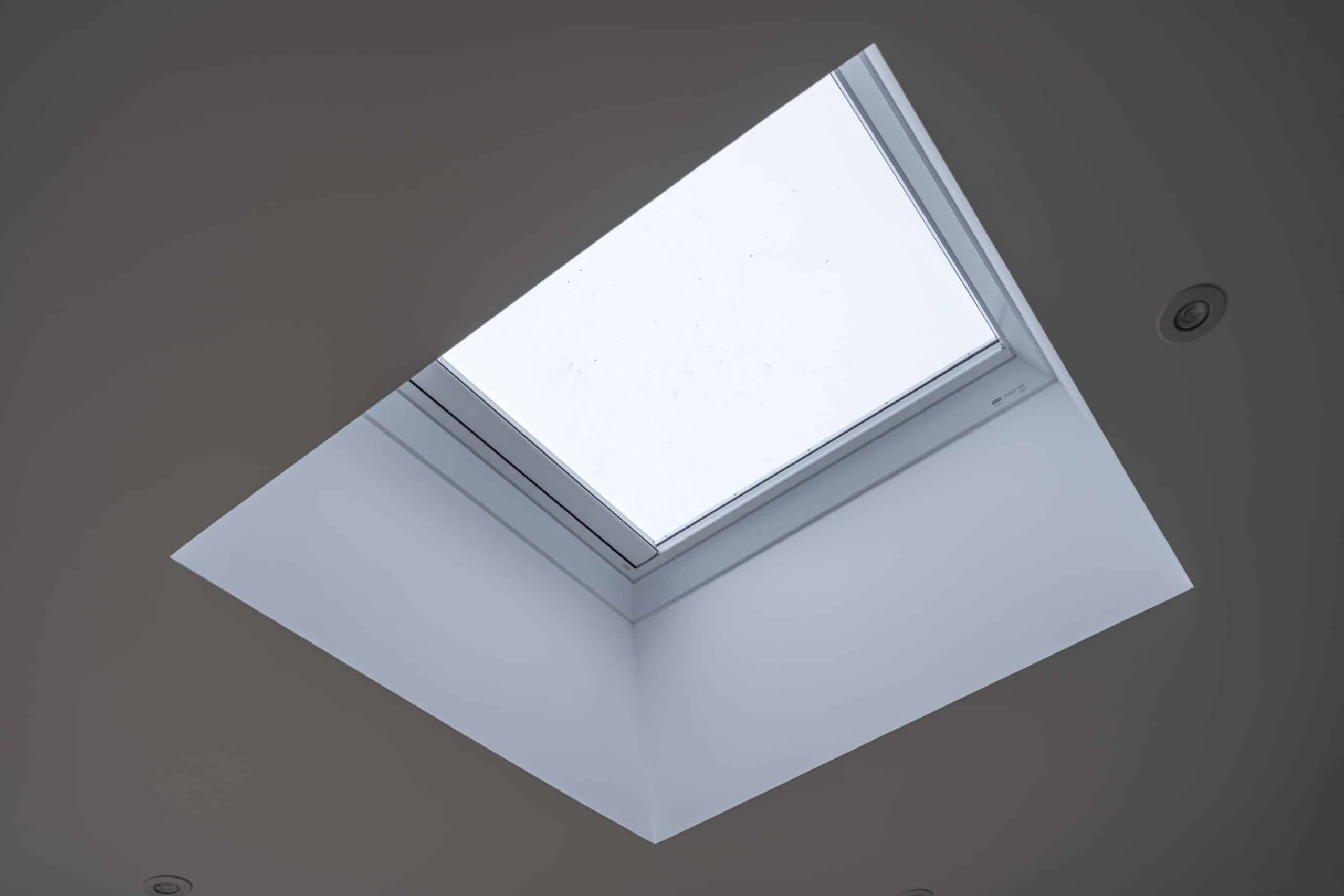 L’un des éléments forts du projet est l’intégration d’un puits de lumière dans le salon. Placé au cœur du plafond plat, il permet d’apporter un éclairage zénithal généreux tout au long de la journée.