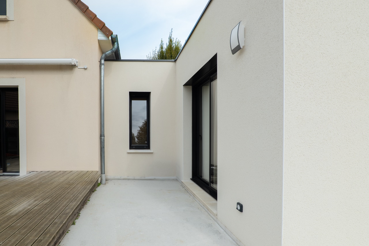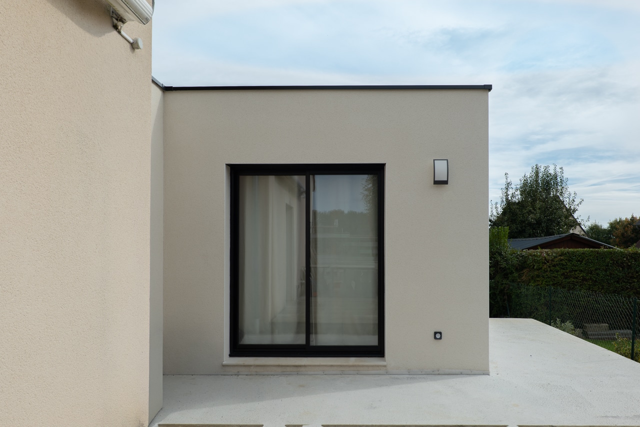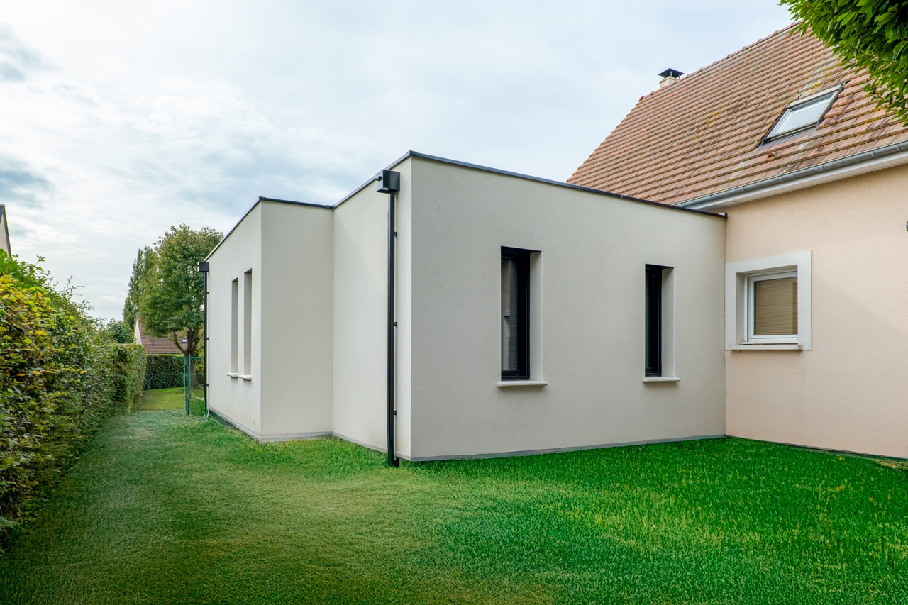 Résultat : une extension à toit plat parfaitement intégrée, qui dialogue avec l’architecture traditionnelle de la maison d’origine.