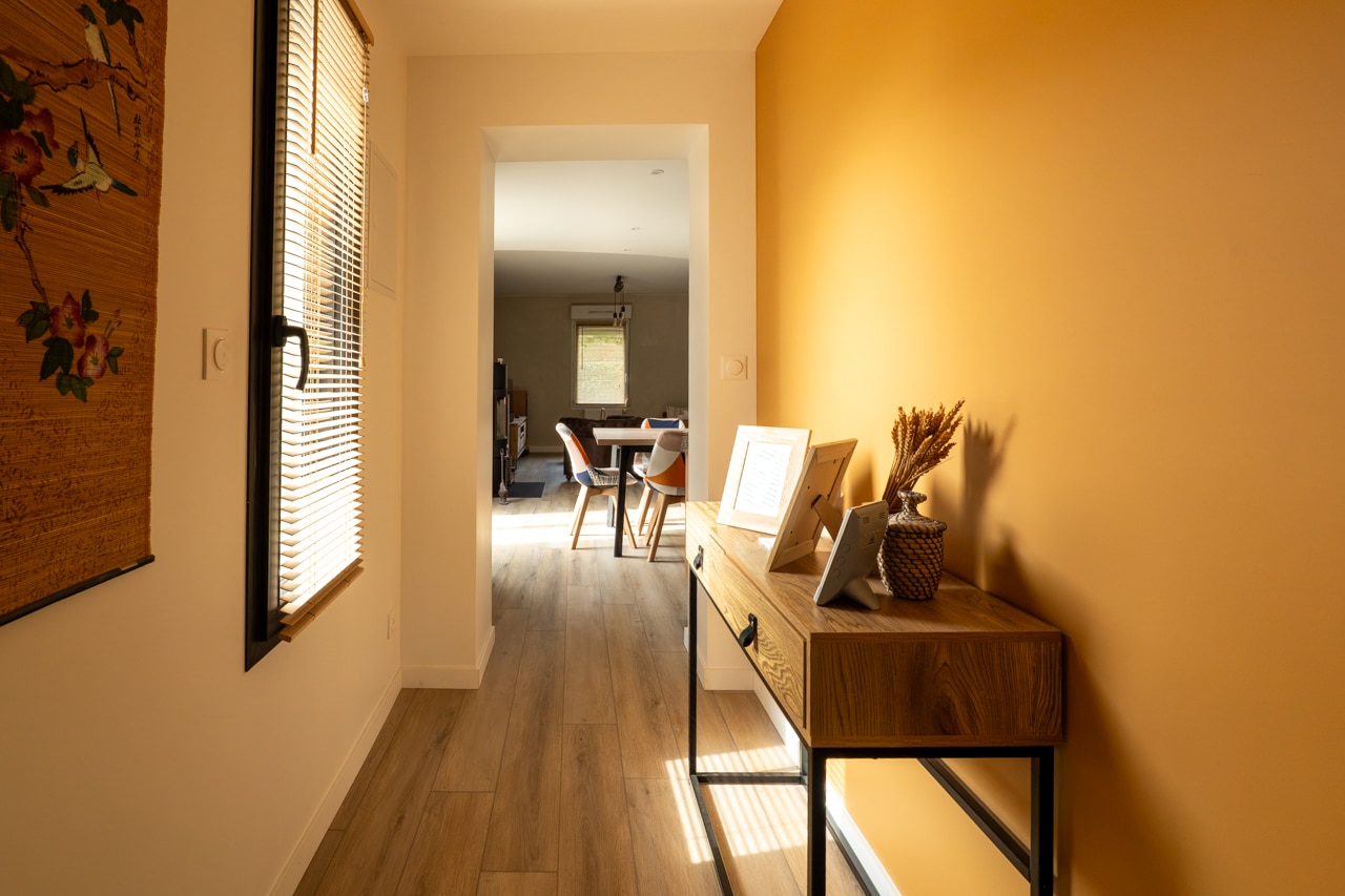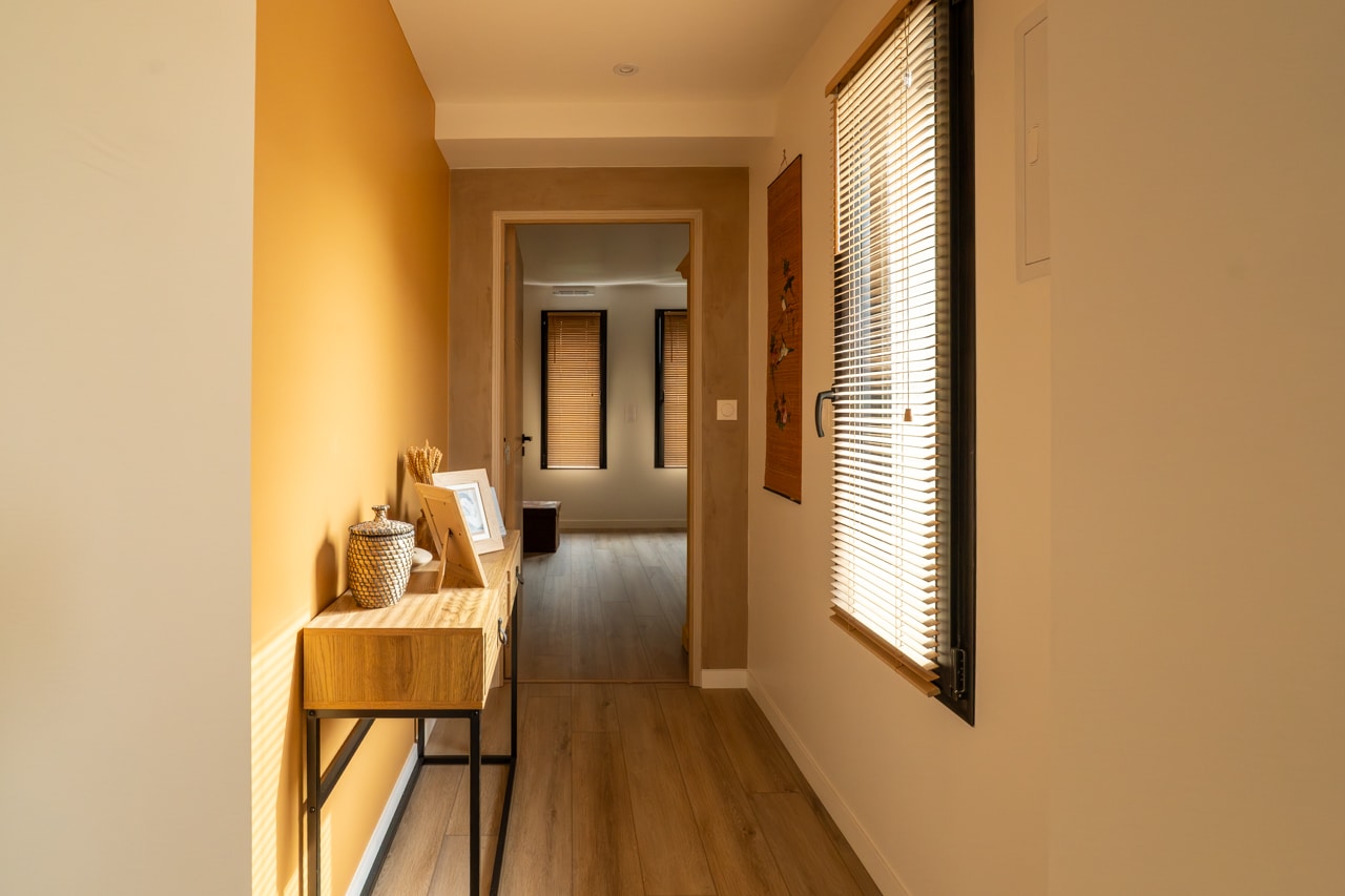 Pour relier harmonieusement l’extension à la maison existante, un passage / couloir de liaison a été créé. Ce nouvel espace permet de :