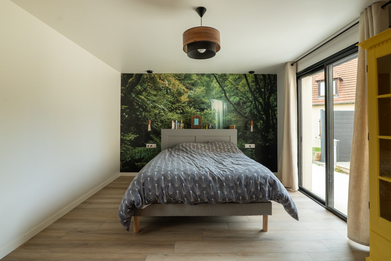 Une chambre spacieuse, ouverte sur l’extérieur grâce à une large baie vitrée